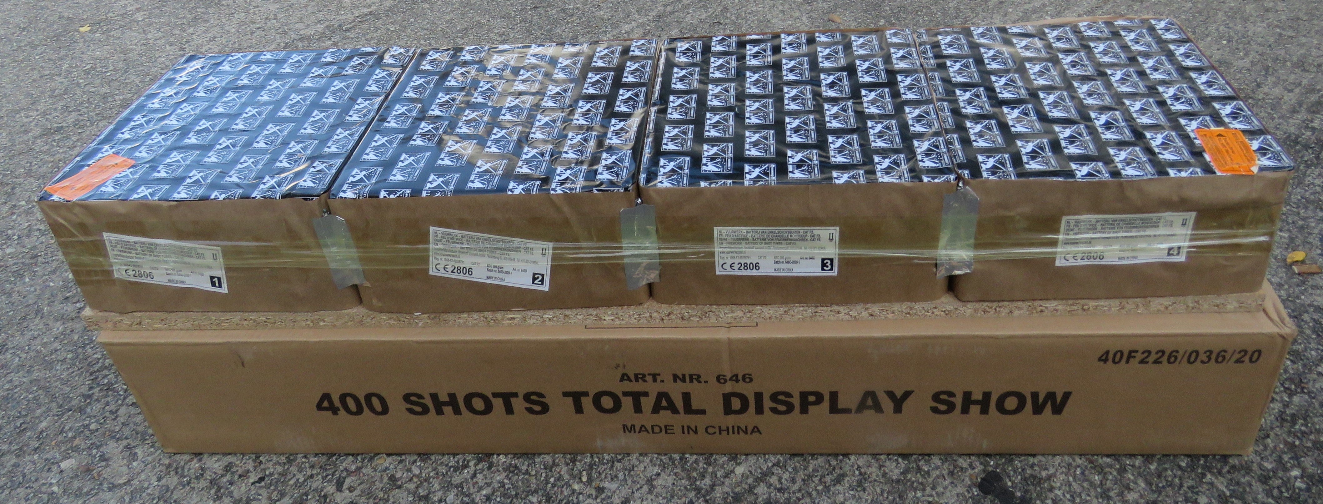400 Schuss Total Display Box - Großes Verbundfeuerwerk mit 400 Schuss und 2 Kg Pulver. Fertig Verleitetes Verbundfeuerwerk mit Mega Finalen. Laufzeit Zusammen 90 Sekunden. Ein Komplettfeuerwerk für den Kleinen Pyromanen.