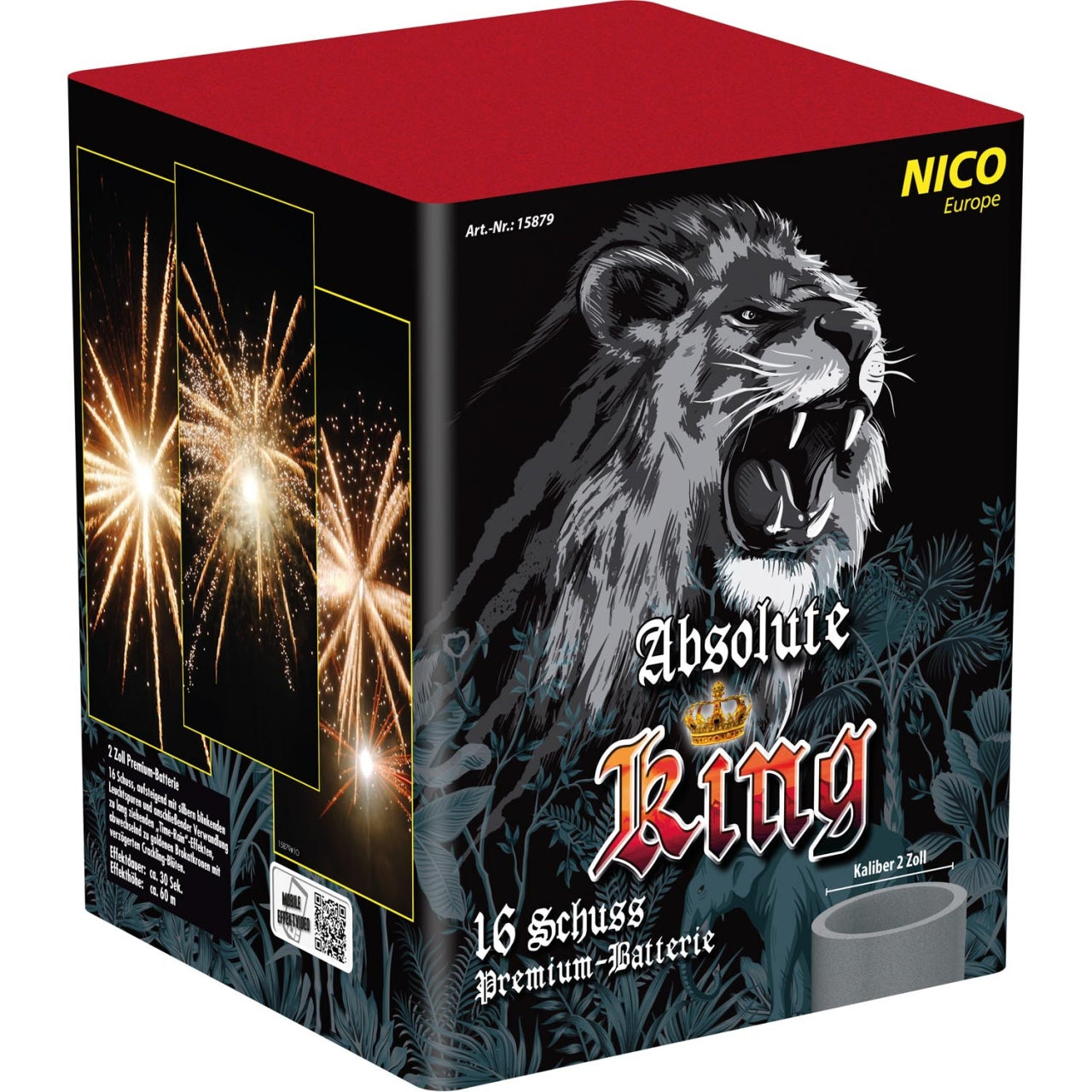 "Absolute King" mit 16 Schuss, aufsteigend mit silbern blinkenden Leuchtspuren und anschließender Verwandlung zu lang ziehenden Time-Rain-Effekten, abwechselnd zu goldenen Brokatkronen mit verzögerten Crackling-Blüten.
