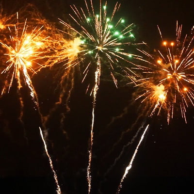 Großkalibrige Bombetten-Batterie mit Abschuss im 3er Fächer von Brokatschweifkometen zu großen Goldflimmerpalmen mit Dahliensternen in Rot-Gelb, Purpur-Gelb, Grün-Gelb, Rot-Blau, Gelb-Blau, Grün-Blau und Rot-Purpur. Immer im Farbwechsel geschossen.