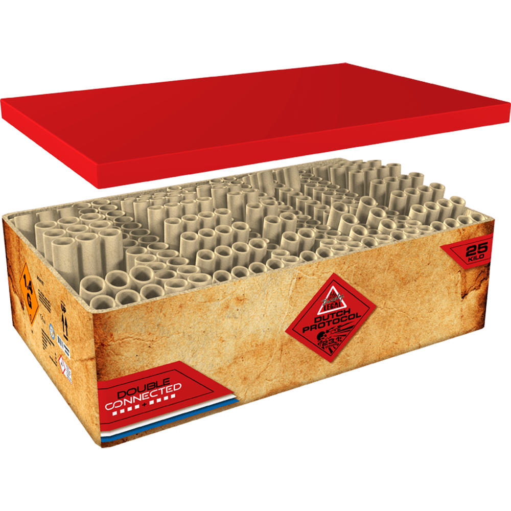 Dieser doppelte, zusammengesetzte Compound ist mit holländischer Pracht gefüllt. Es dominieren die Farben Rot, Weiß und Blau, aber natürlich auch Orange und Gold. Diese 25 kg schwere Box enthält alle Schussrichtungen und du wirst mit Sicherheit der Chef in der Nachbarschaft sein!
