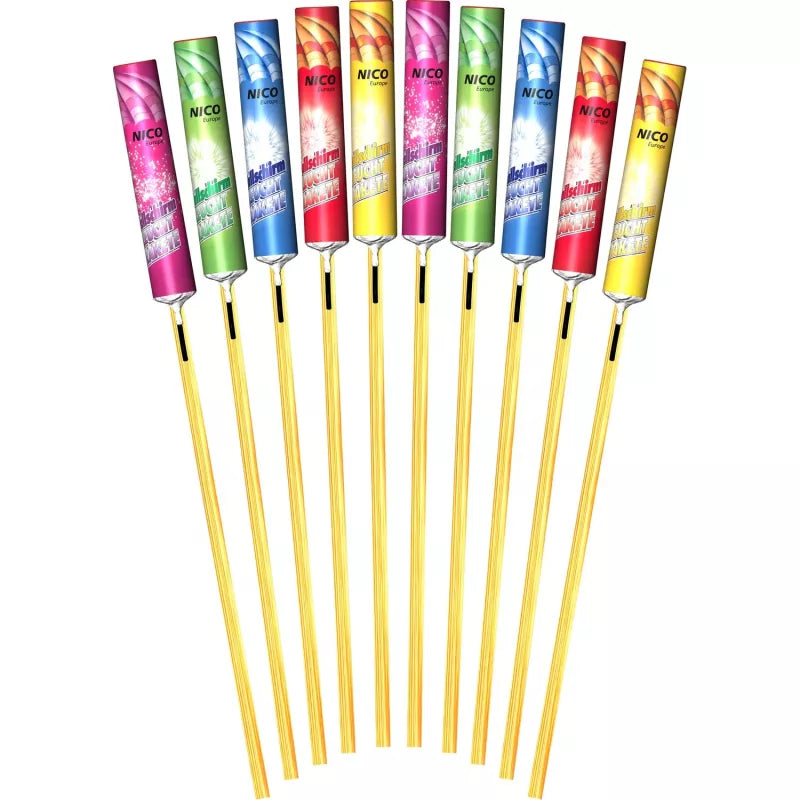 Die NICO Fallschirmraketen sind 5-fach sortiert und begeistern mit einem Effekt aus gelben, roten, blauen, grünen oder silbernen Sternen. Nach dem Effekt öffnet sich ein kleiner Fallschirm und segelt langsam zu Boden.