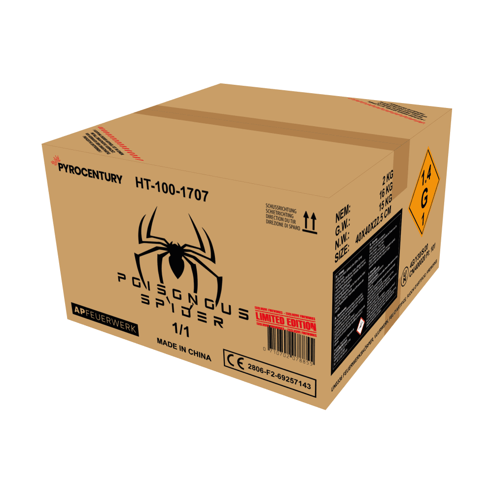 Die Poisonous Spider ist ein Verbundfeuerwerk aus 100 Schuss und fetten 2 Kg NEM.