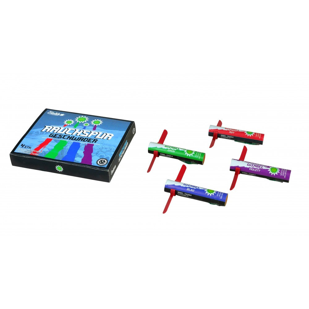 Sortiment aus aufsteigenden Feuerwirbeln, mit Rauchspur in 4 verschiedenen Farben: Rot, Grün, Violett, Blau