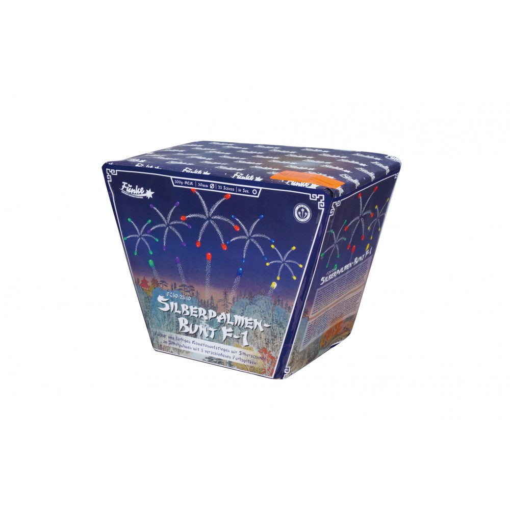 Fächer aus farbigen Kometenaufstiegen mit Silberschweif zu Silberpalmen in 5 verschiedenen Farben.