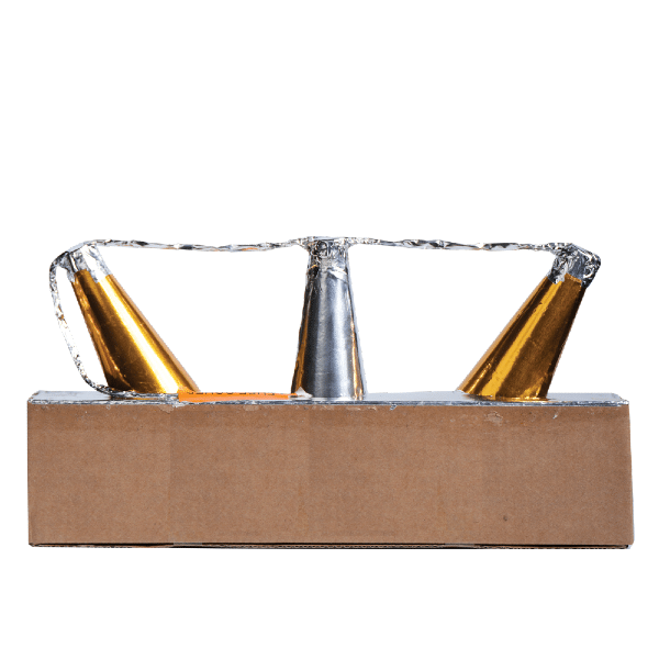 Fertig verleiteter 3er Vulkanfächer. Außen jeweils ein Goldvulkan und in der Mitte ein Silbervulkan. 5m Steighöhe und 50s Brenndauer.